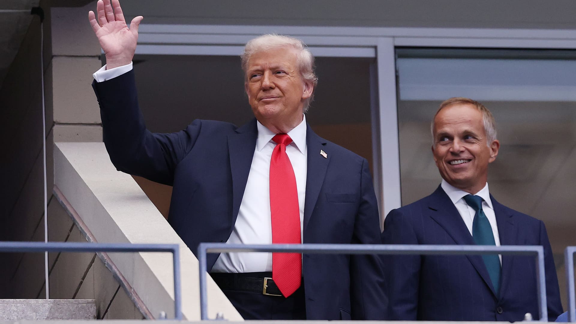 (LR) US President Donald Trump and Rolex CEO Jean Frederic Dufou arrive at the Rolex Suite at the 2025 US Open at the Usta Billy Jean National Tennis Center on September 7th, before the final match of Italian Giannik Thinner and Spain’s Carlos Alcaraz men’s singles.